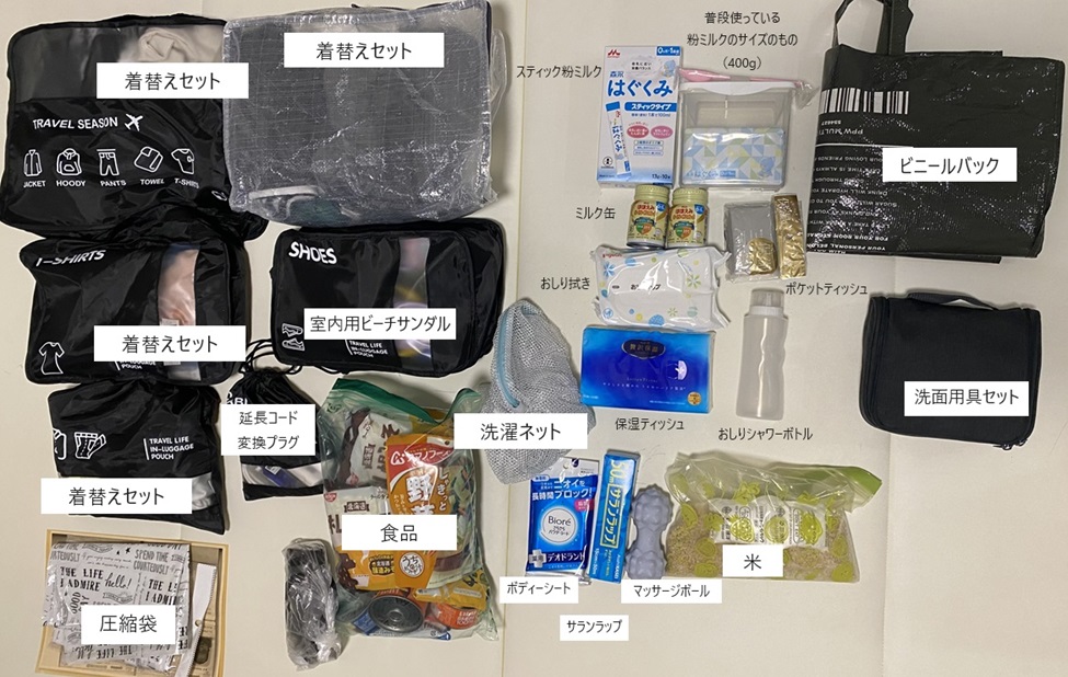 必要最低限の子ども用品(抱っこひも・ベビーカー・水筒など)を中心に持参すること。